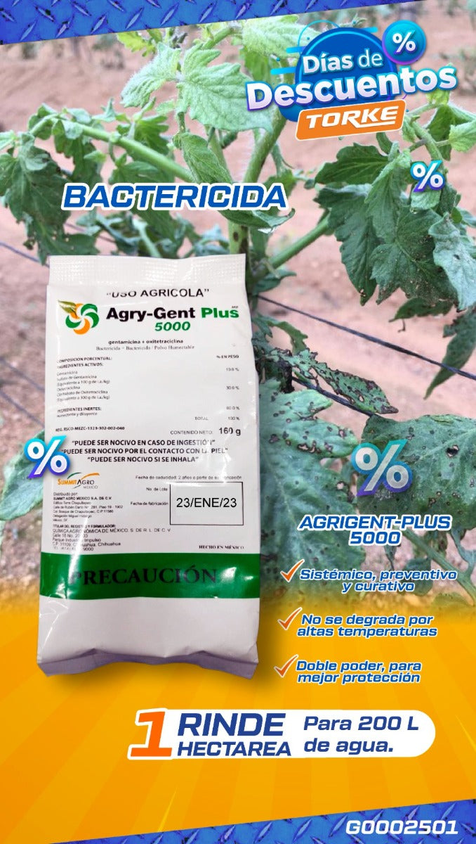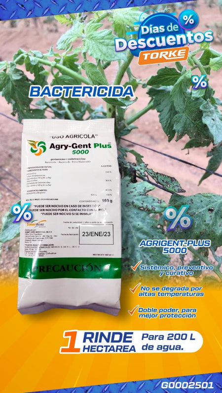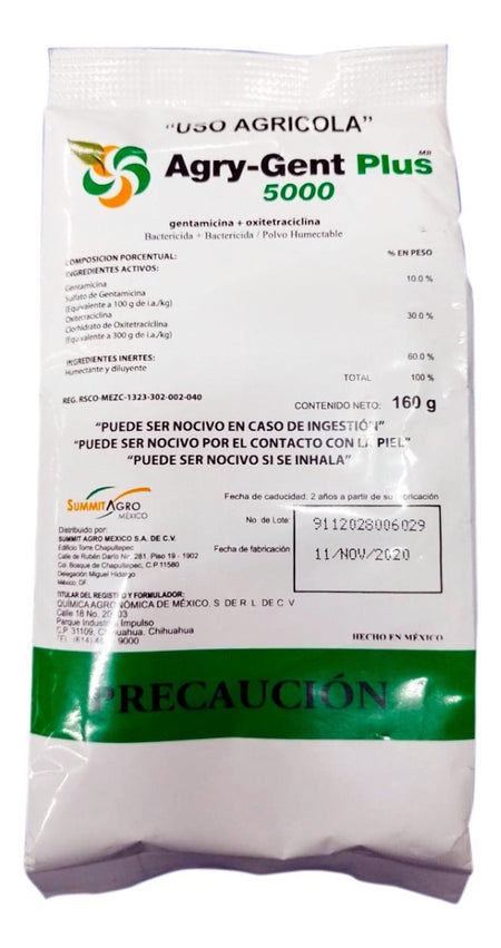 Antibiótico de amplio espectro para el control preventivo y curativo de una amplia gama de bacterias que infestan los cultivos agrícolas. Los ingredientes activos son: Sulfato de Gentamicina al 10% + Clorhidrato de Oxitetraciclina al 30%. El sulfato de Gentamicina con su acción multisitio inhibe la síntesis de proteínas uniéndose irreversiblemente al ribosoma bacteriano, el Clorhidrato de Oxitetraciclina tiene un efecto sinérgico bacteriostático.