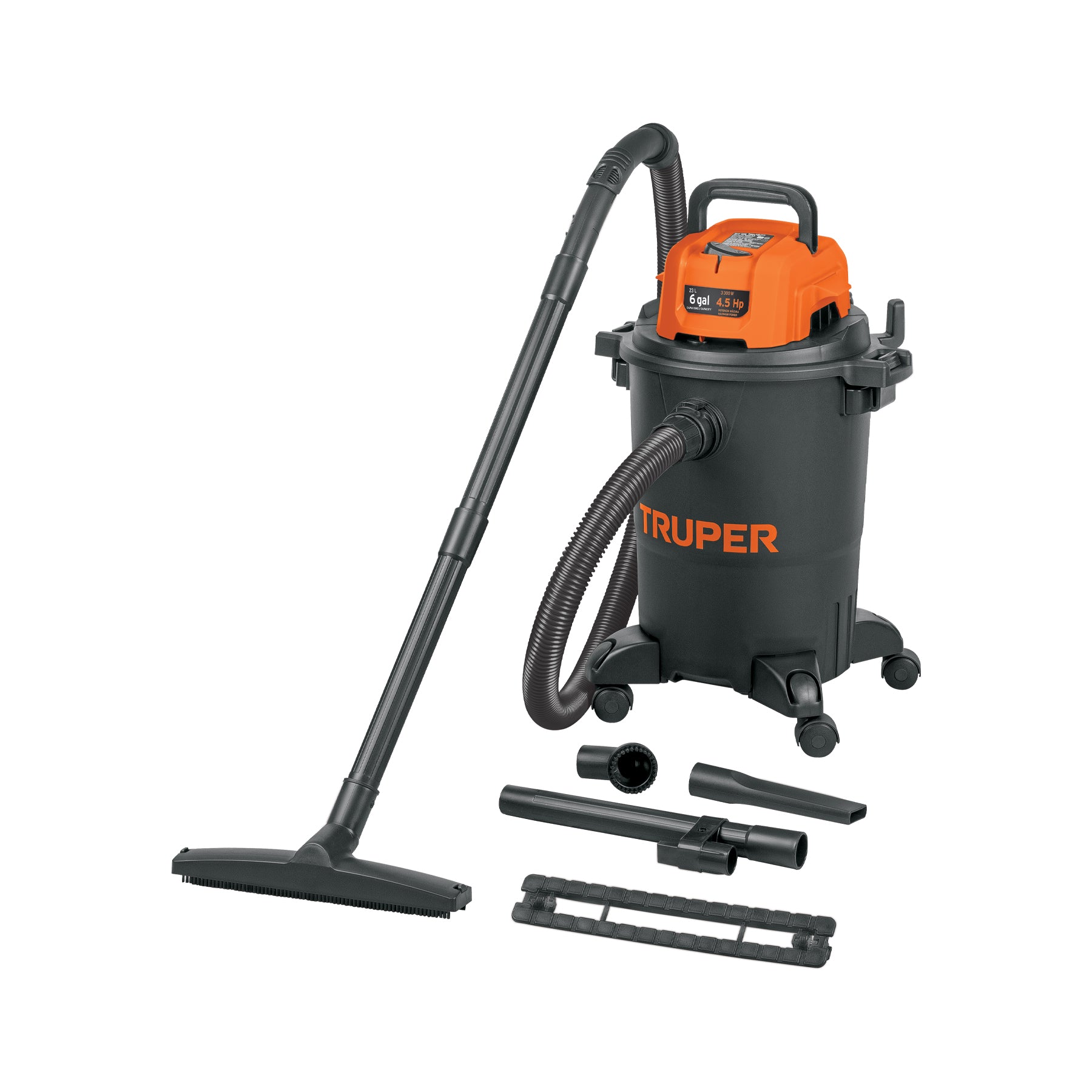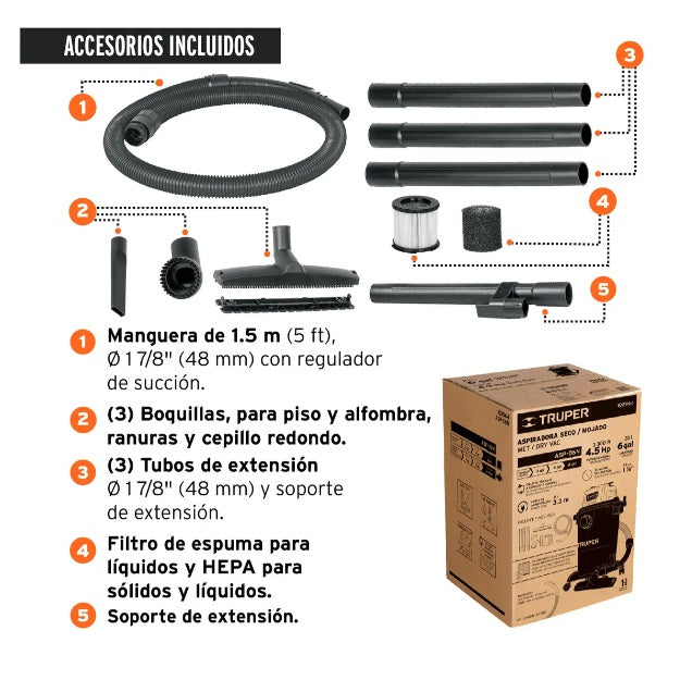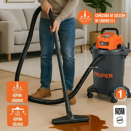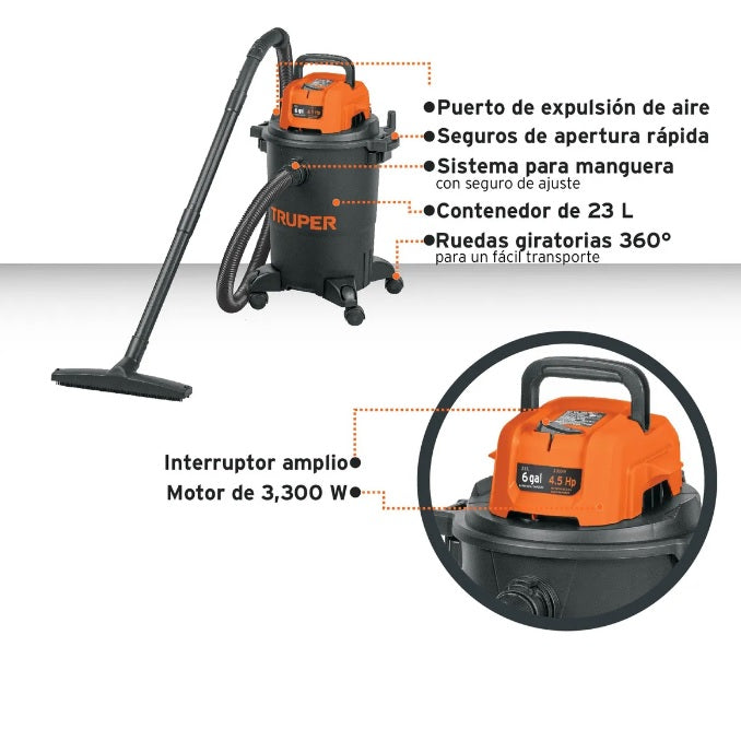 La aspiradora Truper ASP-06N fue diseñada para quienesnecesitan alto rendimiento en tareas exigentes. Con su motor de 4.5 HP, tanquede 23 L, filtro HEPA lavable y diseño robusto con ruedas 360°, esta aspiradoraes ideal para la limpieza de sólidos, líquidos, polvo fino, residuos de obra osuciedad en interiores de vehículos. Diseñada para hogares, talleres o áreas detrabajo que exigen eficiencia, versatilidad y durabilidad, esta aspiradoraofrece una excelente relación entre potencia y practicidad.