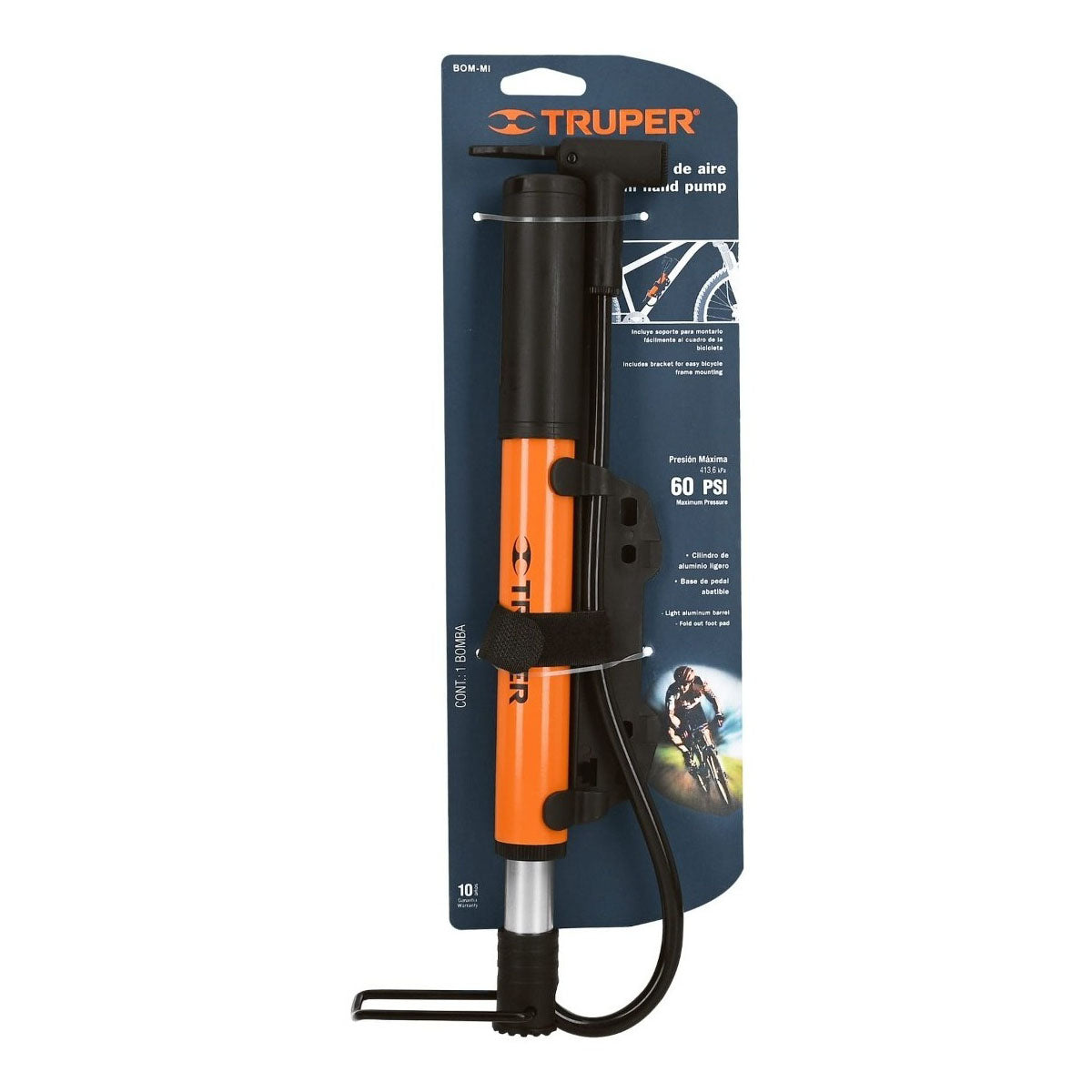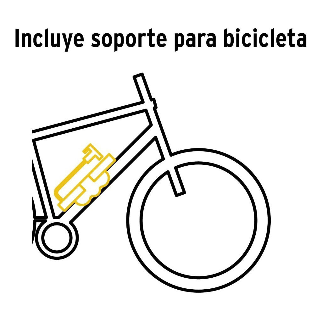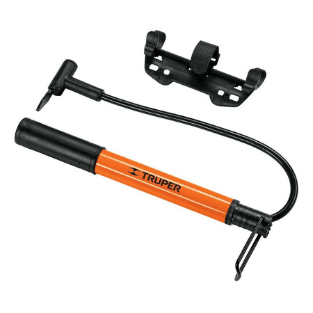 Mini bomba de aire de la marca Truper, cuenta con un cuerpo ligero de aluminio, soporte para montarla al cuadro de la bicicleta, base de pedal abatible, ideal para inflar neumáticos de bicicletas y balones