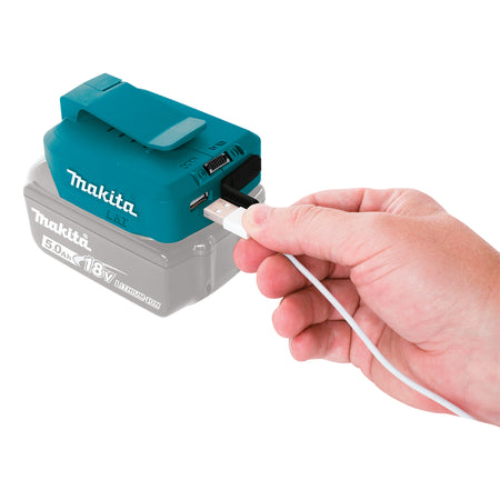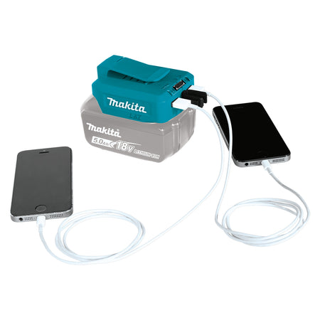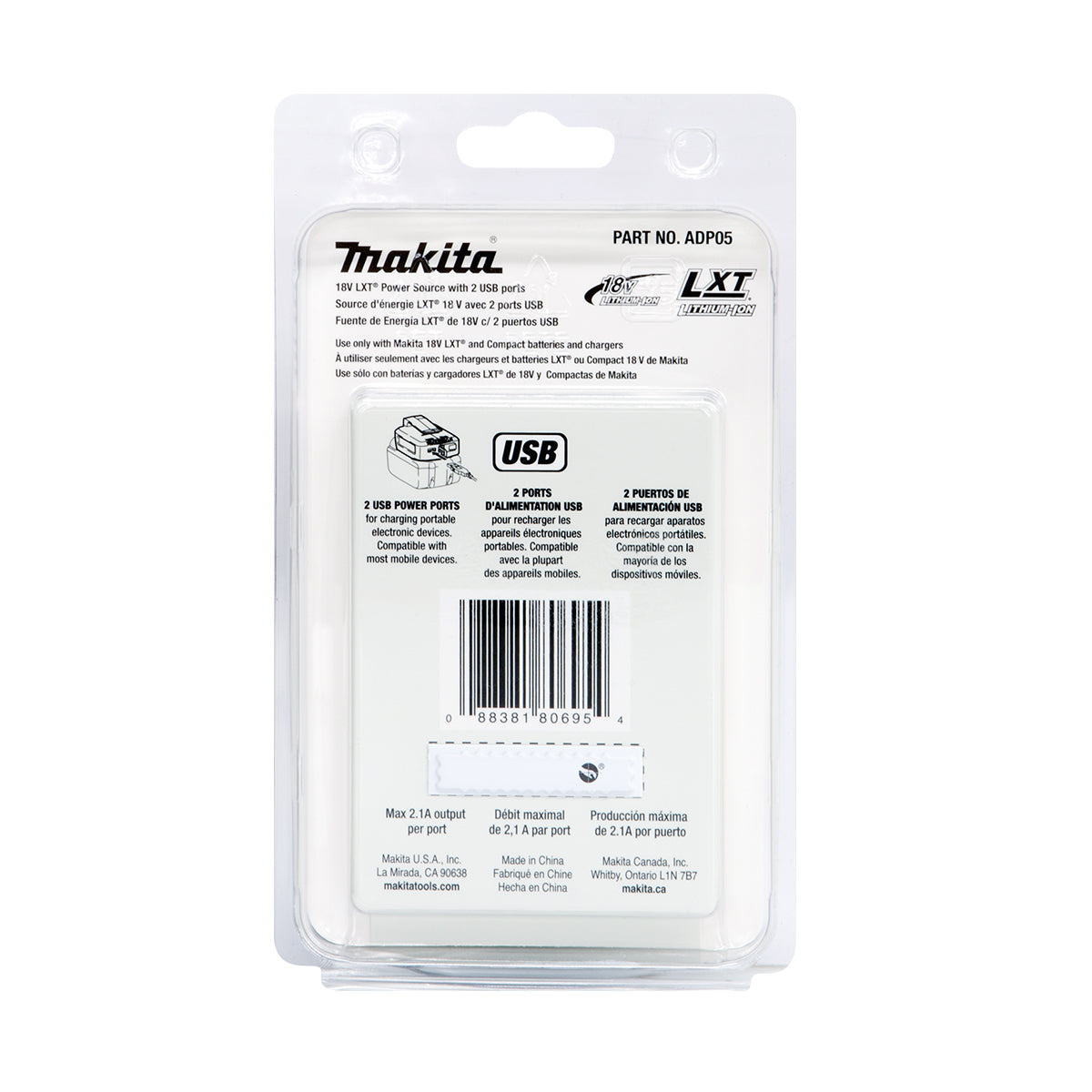 Convierta su batería Litio-Ion de Makita en un puerto de carga portátil con la Fuente de Energía Inalámbrica LXT Litio-Ion de 18V. Monte el ADP05 en su batería litio-ion compatible y obtenga dos puertos de carga USB. Cada puerto USB brinda una descarga de 2.1A. El gancho integrado la sujeta al cinturón o funda, con cubiertas de hule para durabilidad incrementada.