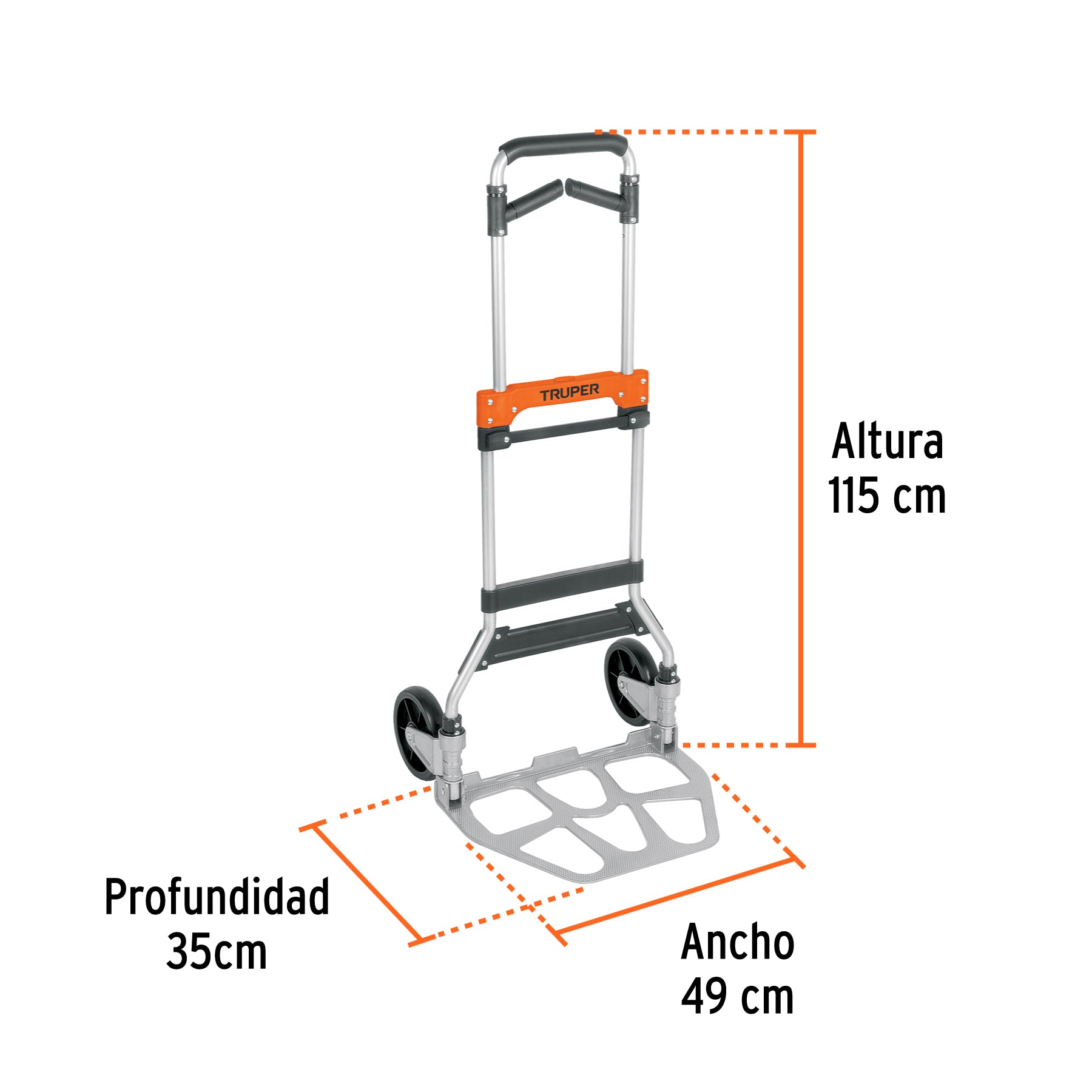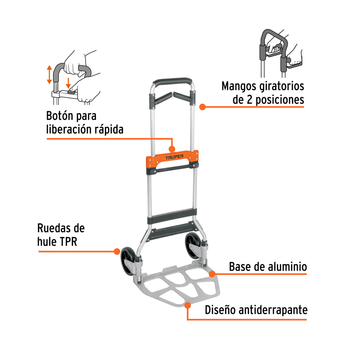 CARACTERÍSTICAS: -Cuerpo de acero y base de aluminio -Ligero y compacto para su fácil transportación y almacenamiento -Ruedas de TPR y polipropileno de larga duración -Llantas y base plegables en un solo paso -Mango telescópico para aumentar la altura con giro a 2 posiciones