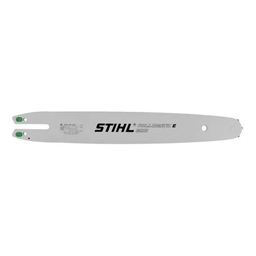 Barra STIHL ROLLOMATIC está formada de tres placas metálicas soldadas entre sí por inducción, de que la intermedia presenta grandes huecos. De este se consigue una gran estabilidad con un peso reducido. como todas las espadas STIHL está fabricada en acero al cromo