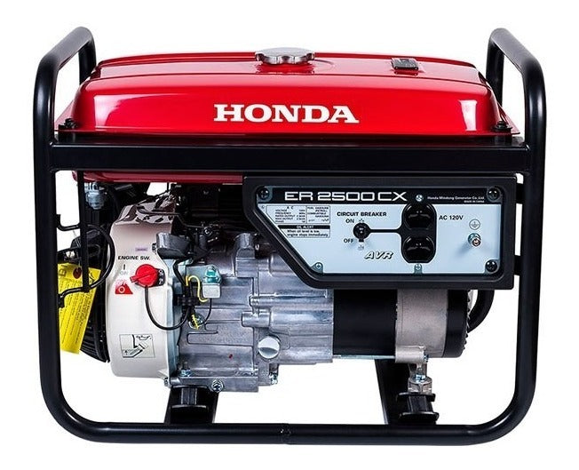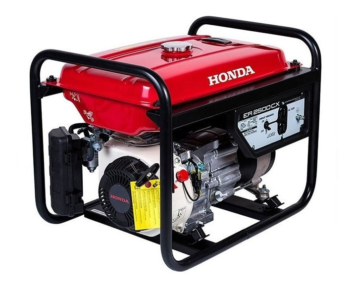 Generador monofásico de 2.2 Kva de potencia. Salida de 220 V en corriente alterna y 12 V en corriente continua, con sistema 'AVR' (regulador automático de tensión) que permite compensar fluctuaciones de potencia cuando la carga varía. Su motor de 4 tiempos está refrigerado por aire brindando una mayor autonomía en comparación a las versiones de 2 tiempos.GENERADOR. ER2500CX HONDACARACTERISTICAS:-Motor:Tipo de Motor: GP160Cilindrada: 163 cm3Potencia Neta: 4.8 HP a 3600 RPMEncendido: TransistorizadoArranque: Manual-Generador:Frecuencia C.A.: 50 Hz.Voltaje C.A.: 220 VPotencia Máxima C.A.: 2.2 KvaPotencia Nominal C.A.: 2 KvaSalida C.C.: NoUso Continuo: 11.6 Hs.Nivel de Ruido: 91 dB (A)-Dimensiones:Ancho: 530 mmLargo: 681 mmAlto: 571 mmPeso en Seco: 40 Kg. ESPECIFICACIONES:Capacidad de Combustible: 14.5 Lts.Consumo Específico de Combustible: 1.4 Lts/Hs. a 3600 RPMCapacidad de Aceite: 0.6 Lts.Eco Throttle: NoIndicador Nivel de Combustible: SiAlerta de Aceite: SiRegulador de Voltaje: AVRVoltímetro: SiInterruptor térmico C.A.: SiInterruptor térmico C.C.: No