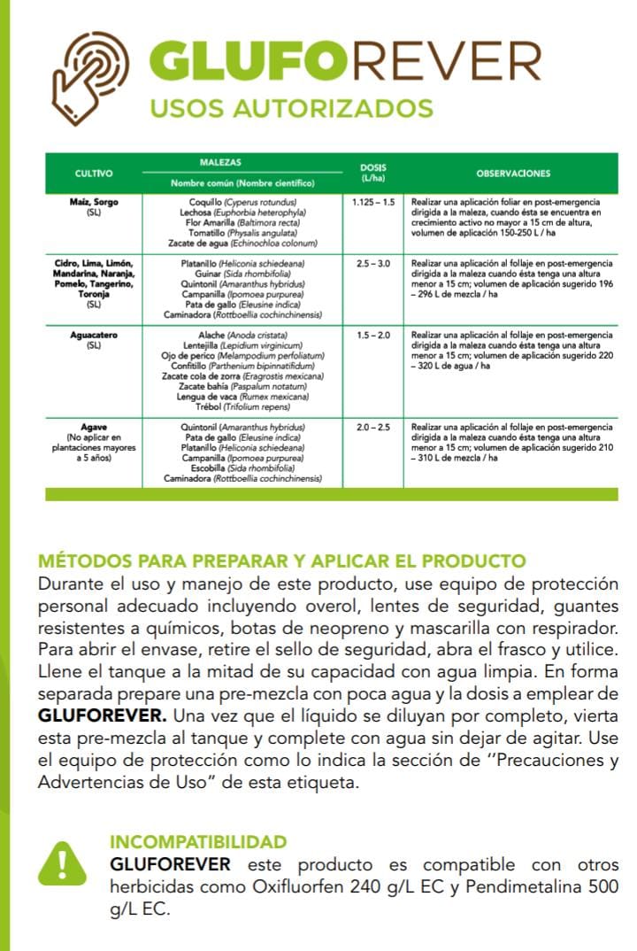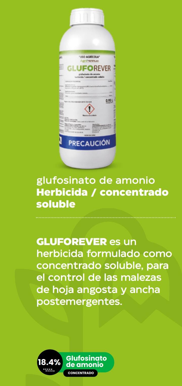 GLUFOREVER es un herbicida formulado como concentrado soluble, para el control de las malezas de hoja angosta y ancha postemergentes.