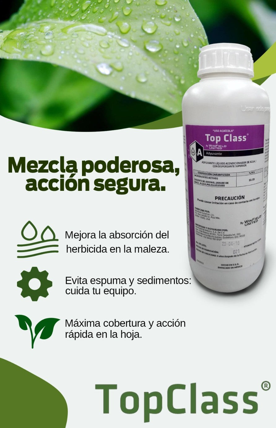 Top Class aumenta la efectividad a las aplicaciones de herbicidas y fungicidas reúne las características y los requerimientos de sulfato de amonio necesario para que el glifosato y otro tipo de herbicidas post-emergentes tengan una absorción inmediata.