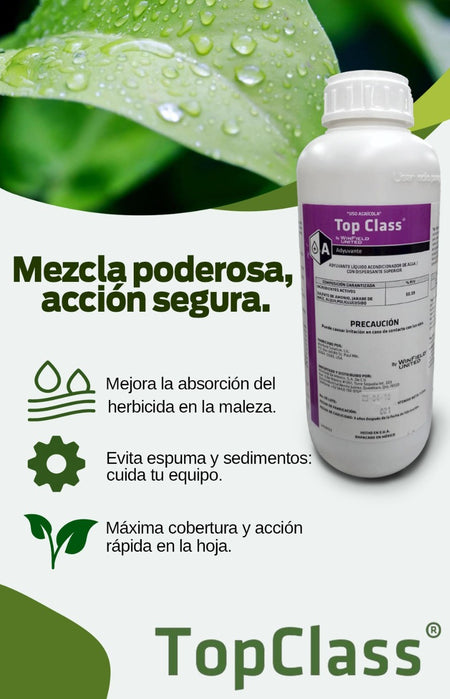 Top Class es una formulación única patentada que contiene 2 ingredientes a base de fructuosa de maíz mezclados con sulfato de amonio líquido y un efectivo agente antiespumante dan como resultado un producto único y altamente efectivo.