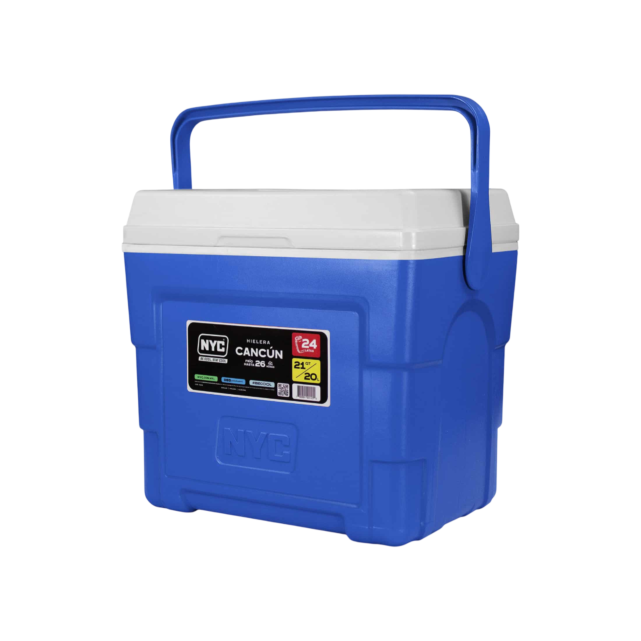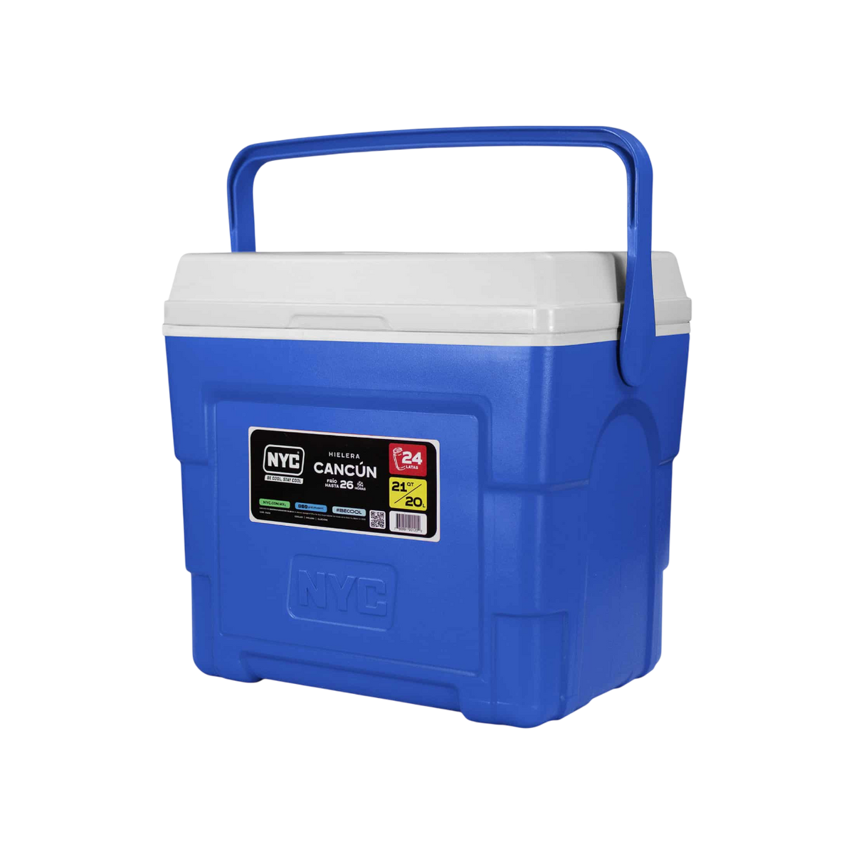 Hielera NYC 21 qt con capacidad de almacenar hasta 24 latas, es ligera y fácil de transportar por su asa superior, ideal para llevarla en espacios reducidos manteniendo la temperatura de tus alimentos y bebidas hasta por 26 horas.