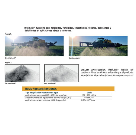 InterLock® funciona con herbicidas, fungicidas, insecticidas, foliares, desecantes y defoliantes en aplicaciones aéreas o terrestres.