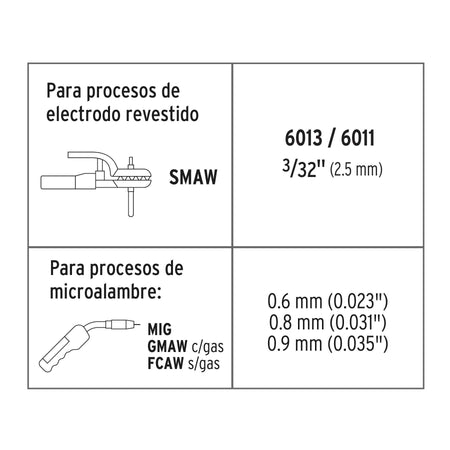 Para electrodo revestido 6013 / 6011 (Hasta 3/32"), y MIG (Hasta 0.9 mm)